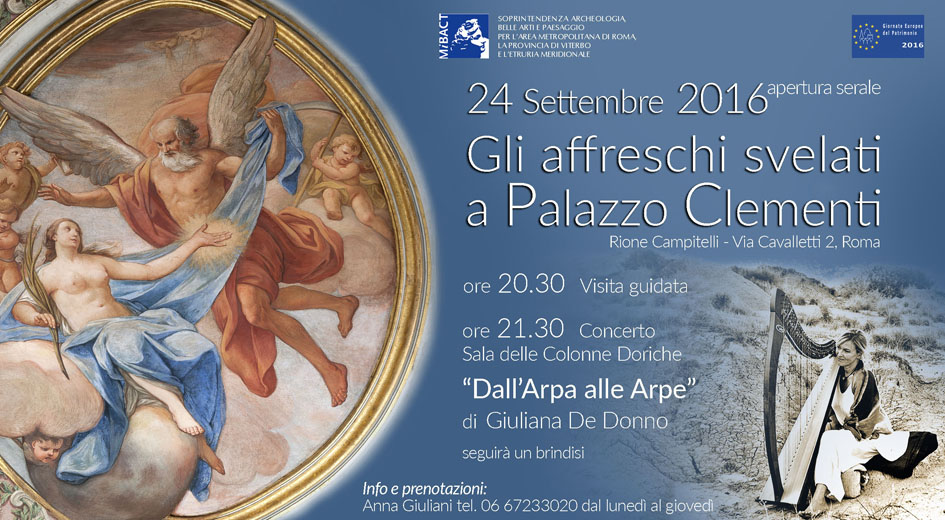 Alle 21.30 di sabato 24 settembre 2016 la Sala delle Colonne Doriche di Palazzo Patrizi Clementi ospiterà il concerto“Dall’Arpa alle Arpe” di Giuliana De Donno, arpista di fama internazionale che ci condurrà in uno straordinario viaggio nel magico mondo dell’arpa popolare.