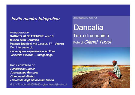 Si è tenuta al Museo della Ceramica di Palazzo Brugiotti (VT) sabato 20 settembre l’inaugurazione della mostra reportage di Gianni Tassi “Dancalia – terra di conquista” che ha registrato il tutto esaurito. L’evento è realizzato da Associazione Photo Art, con il contributo della Fondazione Carivit, Associazione Stampa Romana, Comune di Viterbo e Università della Tuscia. Un pubblico numerosissimo ha seguito con grande attenzione gli interventi di Vincenzo Piscopo, geologo e vulcanologo dell’Università della Tuscia e di Luca Lupi, esploratore, scrittore e massimo esperto della regione africana al confine tra Etiopia ed Eritrea (chiamato anche triangolo di Afar) protagonista degli scatti in mostra del giornalista e fotoreporter Gianni Tassi.