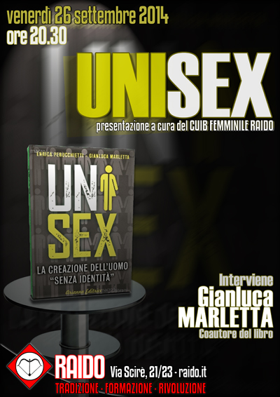 Il 26 settembre sarà presentato il nuovo volume di Perucchietti e Marletta UNISEX presso l’Associazione Raido in via Scirè 23.