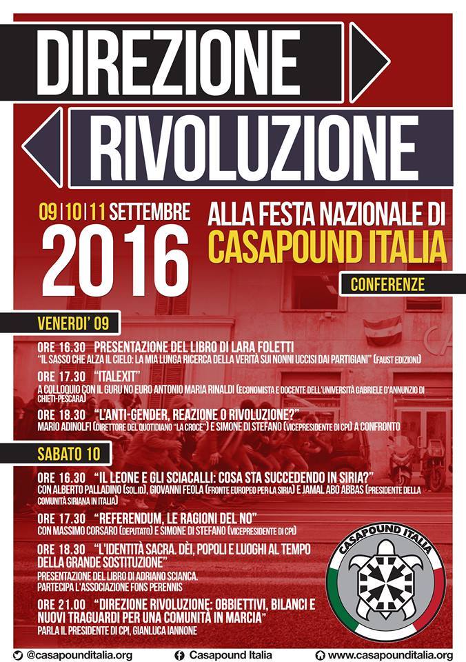Roma, 6 settembre – Aprirà venerdì 9 settembre alle 16.30 con la presentazione del libro-verità di LARA FOLETTI  “Il sasso che alza il cielo: la mia lunga ricerca della verità sui nonni uccisi dai partigiani” l’edizione 2016 di “Direzione Rivoluzione”, la festa nazionale di CasaPound Italia, in programma fino a domenica 11 settembre al Palazzetto dello Sport di Chianciano Terme. A presentare la manifestazione – tre giorni di politica, cultura, sport, musica e volontariato che, come di consueto, vedranno la partecipazione di militanti e simpatizzanti del movimento in arrivo in Toscana da tutta Italia – sarà il leader di Cpi, GIANLUCA IANNONE, in una conferenza stampa che si terrà giovedì 8 settembre alle 11 nella sede fiorentina di CasaPound, in via Felice Fontana 13,r.
