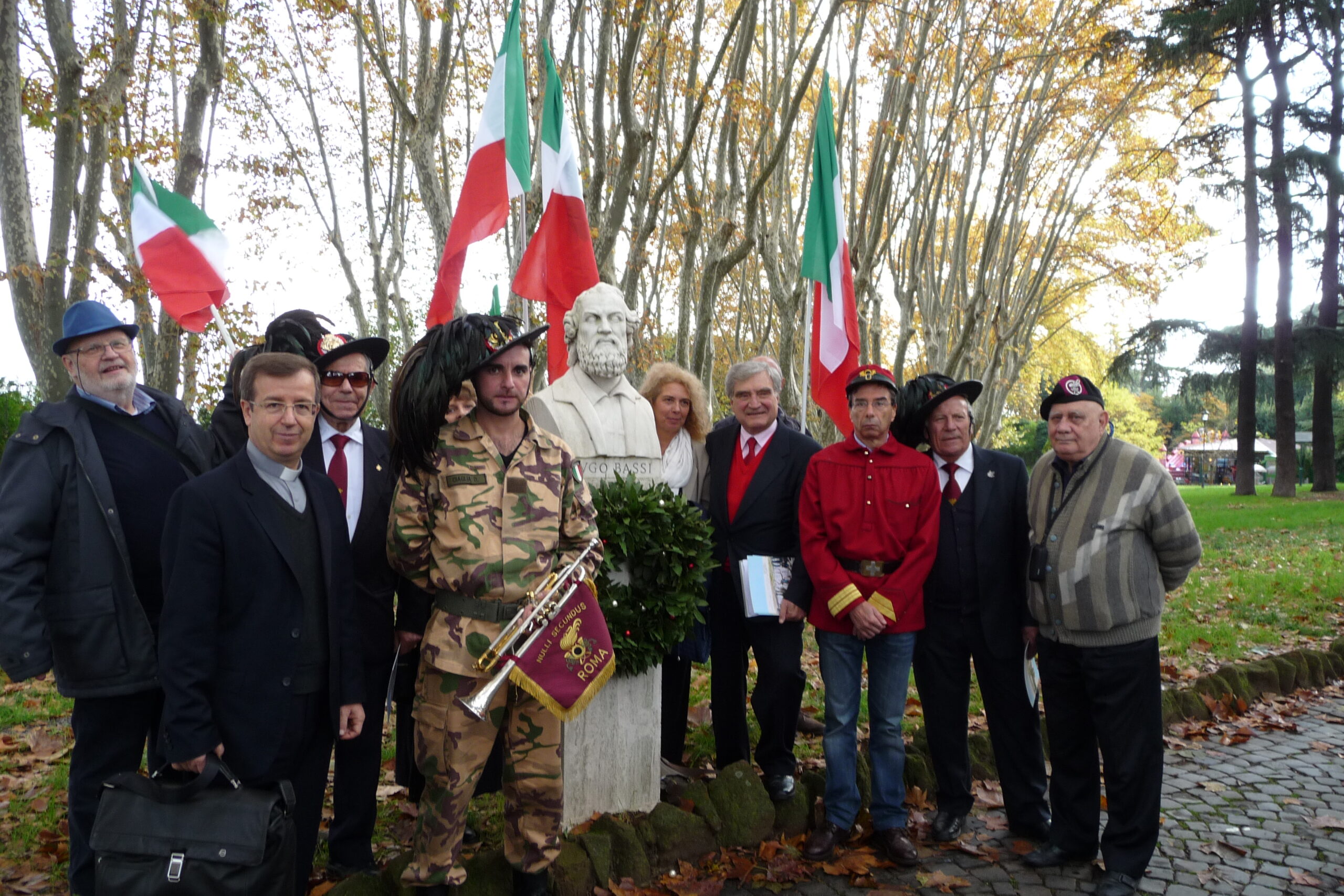 Una domenica sul Colle del Gianicolo per ricordare il patriota e martire P. Ugo Bassi. Con questo spirito l’associazione A. Cipriani Comitato Gianicolo e il Centro Studi Storici dei PP. Barnabiti hanno organizzato, per la mattina del 20 novembre, una visita guidata gratuita al Parco Gianicolense – Parco degli eroi. Nel corso della passeggiata i partecipanti hanno fatto una sosta nel Piazzale Garibaldi, davanti al busto di P. UGO BASSI, dove ha avuto luogo una cerimonia, resa più suggestiva dalle bandiere con il Tricolore e dalla presenza dei Bersaglieri di Roma guidati dal Col. Nunzio Paolucci e rappresentati al Gianicolo dai bersaglieri Arnaldo Marini, Aldo Leonori con il trombettiere Daniele Ciaglia e Massimo Flumeri. A ricordare uno dei patrioti italiani che durante il Risorgimento hanno combattuto con le armi o con la parola per l’unificazione dell’Italia, sono intervenuti Enrico Luciani, per l’associazione A. Cipriani Comitato Gianicolo, P. Filippo Lovison, per il Centro Studi Storici dei PP. Barnabiti che ha deposto una corona d’alloro e Alessandro Manna, per il Comitato Ugo Bassi di Bologna che ha letto la lettera inviata al Santo Pontefice. Prendendo la parola, il presidente Luciani ha espresso la volontà di <sostenere tutte le azioni necessarie per la riabilitazione di Ugo Bassi con l’augurio di poterlo celebrare quanto prima presso la Chiesa di San Carlo ai Catinari, dove fu ordinato sacerdote, chiesa ora chiusa a seguito dei danni provocati dal terremoto>. A ricordare Ugo Bassi erano presenti, tra gli altri, il comandante dei Carabinieri al Gianicolo, Agostino Pinca e Giovanni Adducci per i garibaldini romani.
